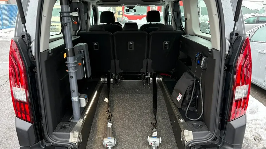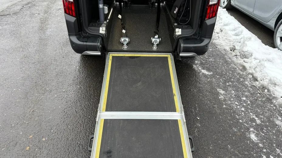 Rampa tylna opuszczana do wjazdu wózkiem inwalidzkim. Oryginalna zabudowa z homologacją, 4x pasy zabezpieczające i asekurujące wózek inwalidzki + pas bezpieczeństwa dla przewożonej osoby.