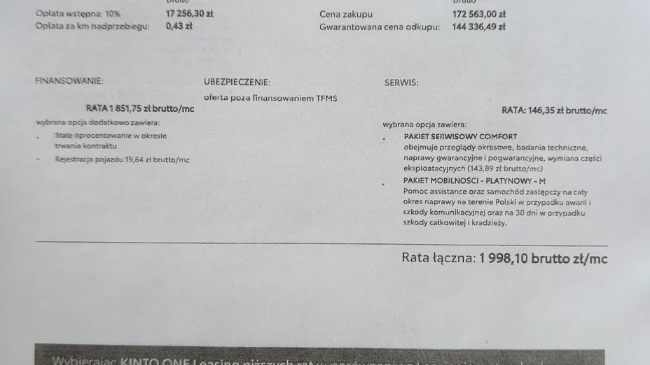 Odstąpię leasing Kinto na firmę. Zostało do spłaty 14 rat. Kwota raty to 1998 zł brutto, w tym zawiera się kwota 146 zł miesięcznie za pakiet serwisowy komfort i pakiet mobilności platynowy.